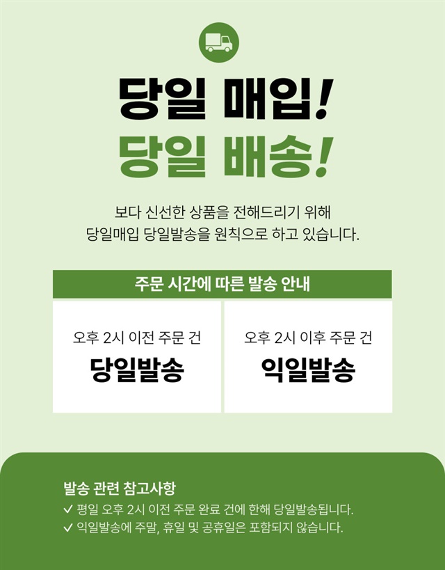 · 배송은 입금확인된 날짜로부터 1~3일 소요되며 최대 7일 이내 제공됩니다. ( 공휴일, 기상악화 등 불가피한 상황에 따라 추가 지연될 수 있습니다.)